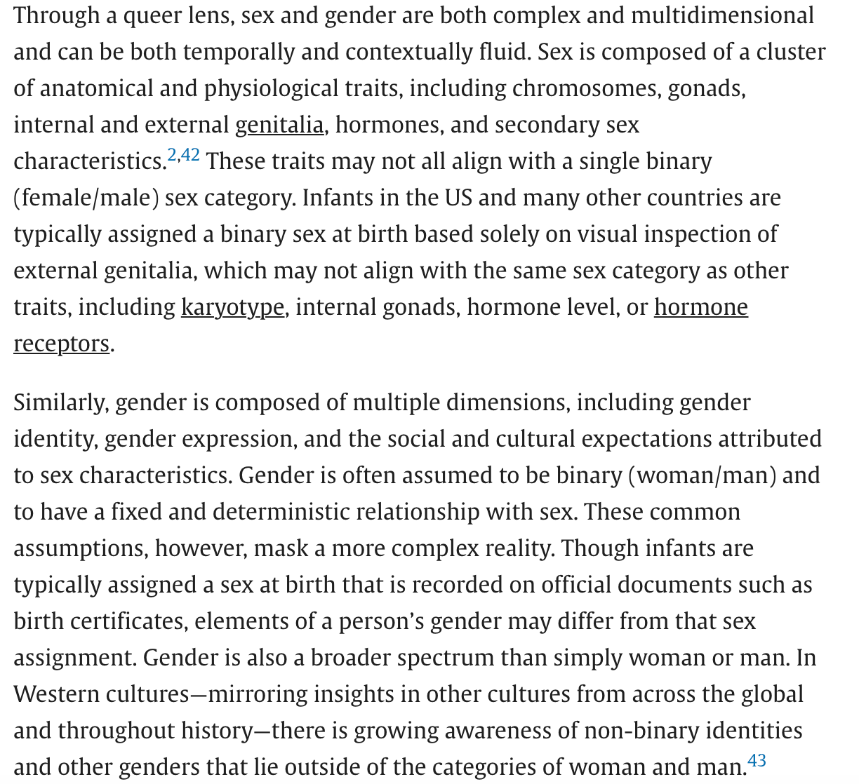 Jamal et al. (2024) Queering genomics: How cisnormativity undermines genomic science. Along with the fact that genomics is often used in laws and policies discriminating against, I found this article interesting because I used to work in neurogenetics many years ago. In this article, Jamal et al. argues that genetics has been researched inaccurately has been recording sex and gender as something binary and static. Instead: