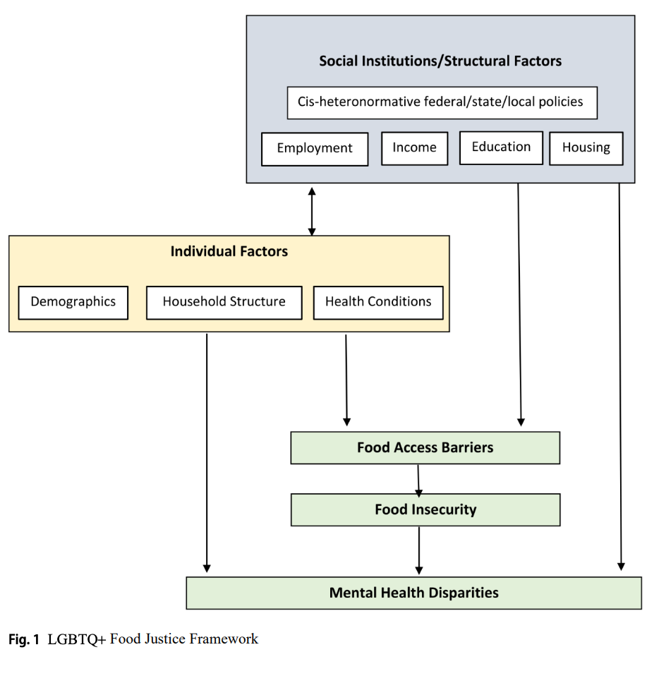 As seen in Figure 1, there are many avenues towards food insecurity. It is not just about issues the individual is facing, but also cis-heteronmative policies which may negatively impact the LGBTQIA+ community. This can include anti-discrimination policies which do not protect LGBTQIA+ people or religious nonprofits who decide not to serve the LGBTQIA+ community or make it difficult for LGBTQIA+ people to receive services. All of these policies and organizations impact the LGBTQIA+ community and lead to possible issues of food insecurity.